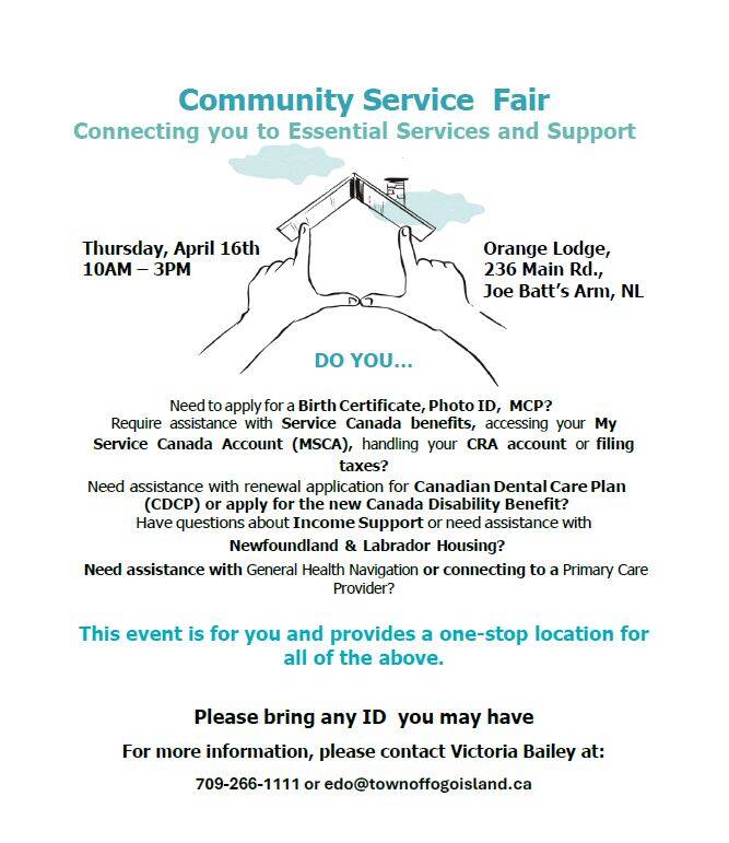 Do you need to access government services such as applying for a Birth Certificate, photo ID, or an MCP card? Do you have questions about Income Support, the Canadian Dental Care Plan or Disability Benefits? Struggling to access health care, or navigate the health care system? Are you a business owner wondering about wage subsidies? Service Canada, and the Government of Newfoundland and Labrador are bringing their services to Fogo Island! This service fair will have representatives from different provincial and federal government departments on site to answer questions and help with applications. No appointment necessary, drop into the Orange Lodge in Joe Batt’s Arm on Thursday April 16, from 10 am – 3 pm. Departments that will be in attendance include: Service Canada, Canada Revenue Agency, Department of Jobs, Growth and Rural Development, Department of Social Supports and Well-Being, Motor Registration, Key Assets NL, Public Legal Information Association of NL, NL Health Services, NL Public Library, and 211NL.